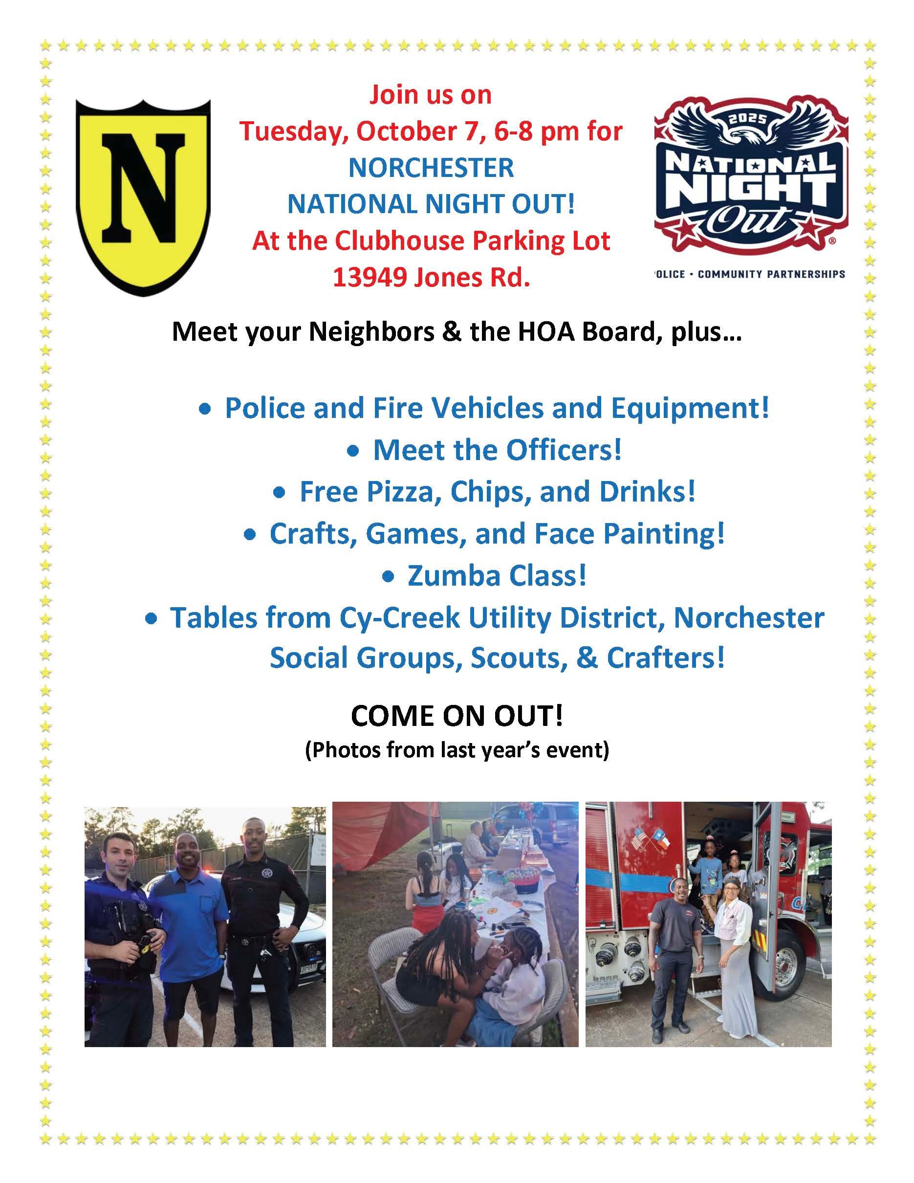 Join us for National Night Out on Tuesday, Oct. 7, from 6-8 pm in the Clubhouse Parking Lot on Jones Road!