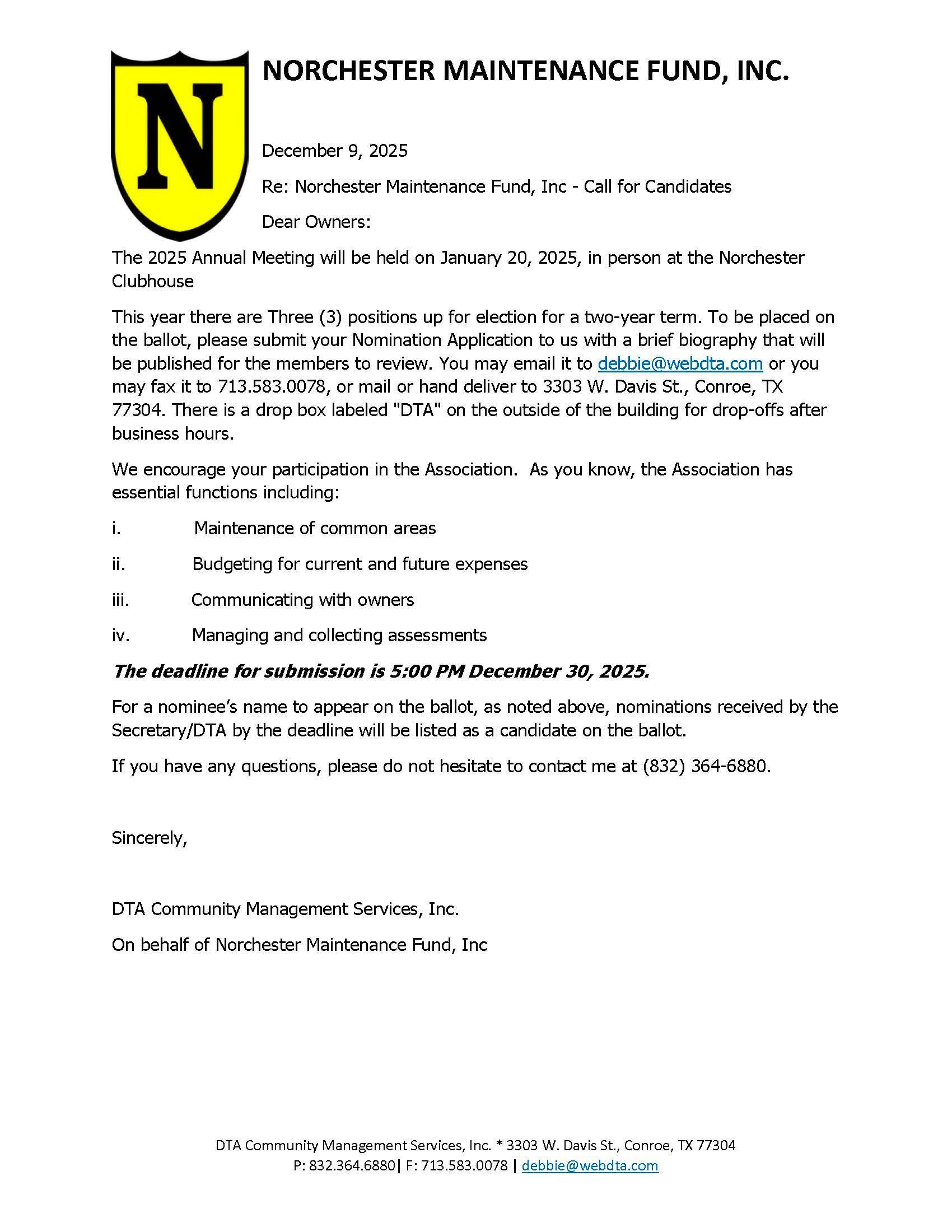There are three (3) open positions on the Norchester NMF/HOA Board. Election will be held in January with the new Board installed at the January Annual Meeting. Want to run? All the info is below. Deadline to submit is December 30!