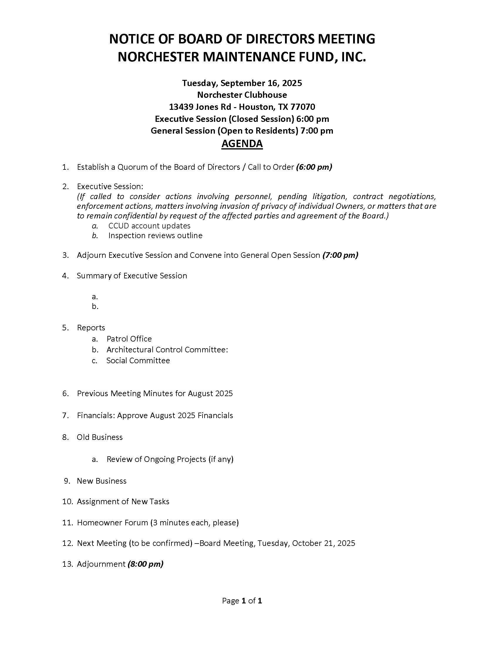 The next monthly public meeting of the Norchester HOA Board will be