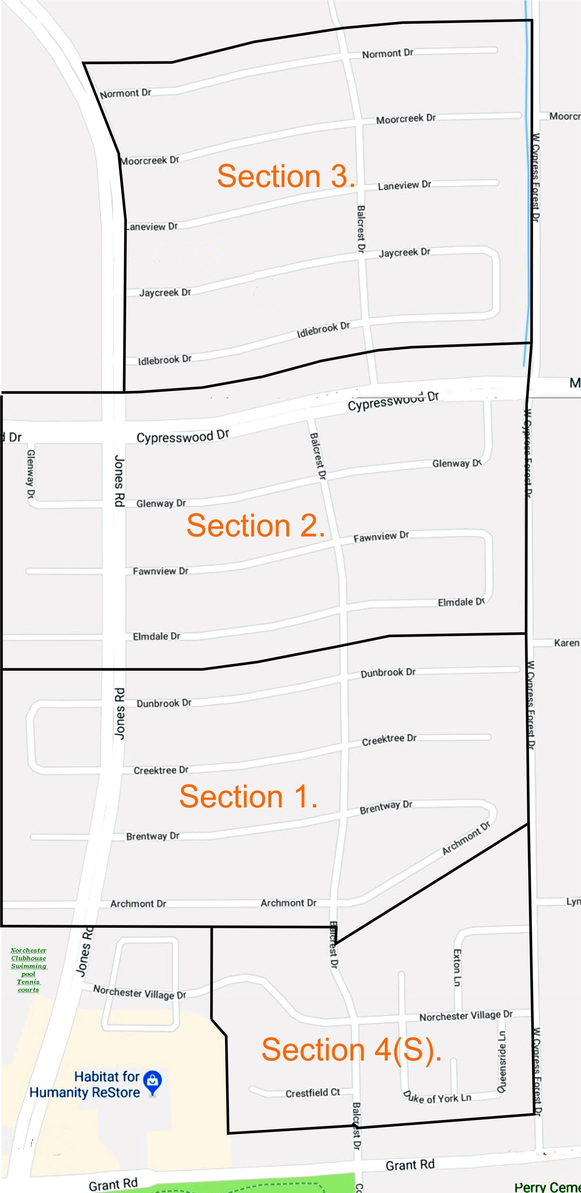 The maps below show the boundary lines for lots in the Norchester Subdivision. The total subdivision encompasses the Norchester Sections 1, 2, & 3, plus Norchester South.