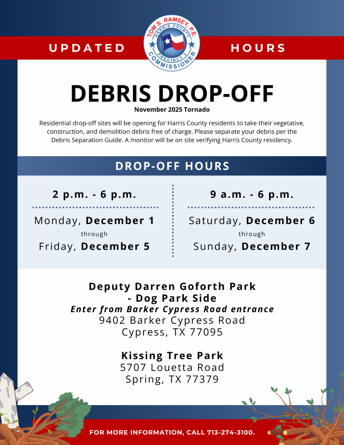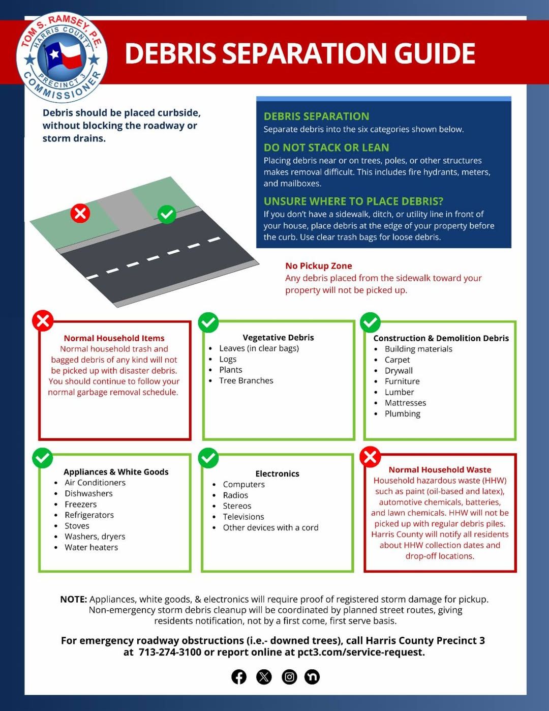 Starting Monday, December 1, 2025, Precinct 3 crews will begin picking up debris in neighborhoods impacted by the tornado. Please follow the debris separation guidelines below to ensure safe and efficient pick-up.