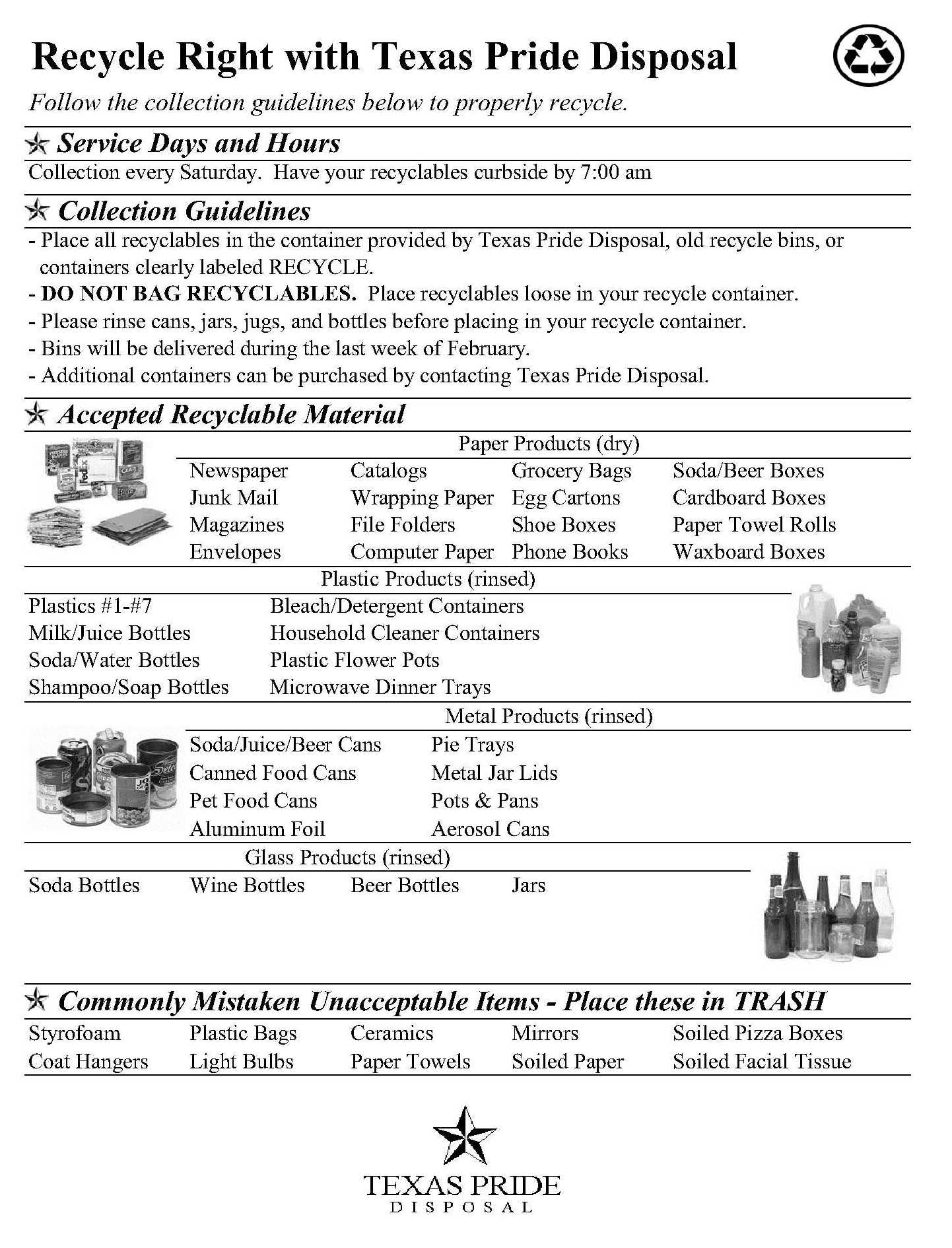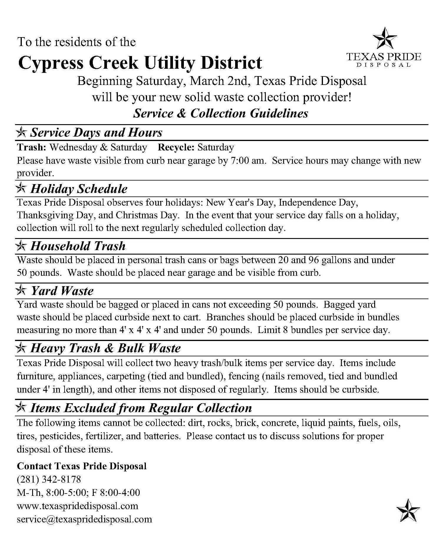 Pickup days are Wednesday and Saturdays. Texas Pride adds large item pickup to Wednesdays as well as Saturdays. Billing for trash services will still be included with you CCUD water bill. They can provide recycling bins to individual residents upon request.