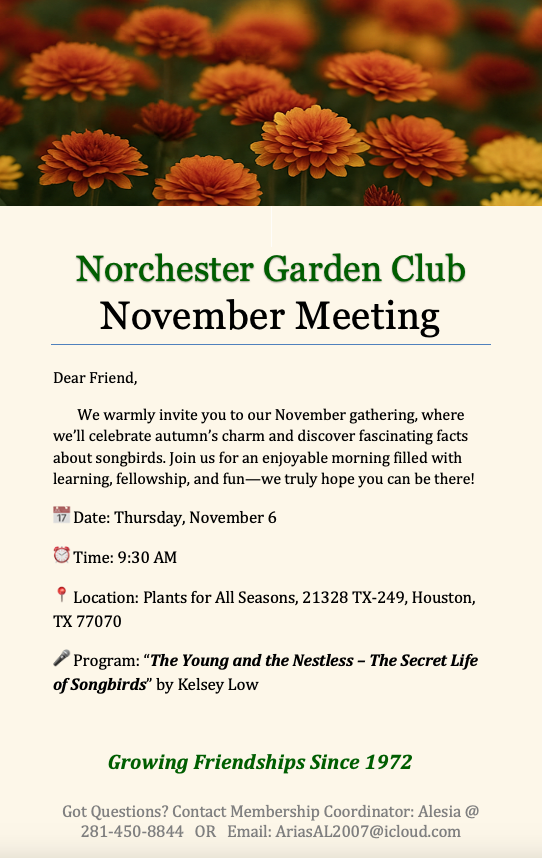 The Garden Club was founded initially to beautify Norchester. Most of the trees on our esplanades were planted as living memorials to deceased members or their spouses. When Harris County acquired the land from Cy-Fair ISD, and when the Association for Better Community Schools raised funds for amenities to the land, Norchester Garden Club raised funds to build the butterfly garden. Norchester Garden Club now has a yearly garage sale which helps fund upkeep of the butterfly garden which is owned by Harris County,but the Norchester Garden Club is committed to keeping it well maintained (weeding, dead heading, mulching).